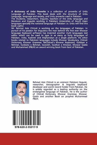 A dictionary of Urdu Proverbs is a collection of proverbs of Urdu Language of Pakistan. This book deals with the structure of Urdu Language, language and society, and Urdu proverbs used in Pakistan. The Students, researchers, linguists, teachers of the Urdu language and literature and linguists working in Pakistani Universities of South Asian languages specially the national language of Pakistan i.e. Urdu will find this book useful.Mr. Rehmat Aziz Chitrali is working on the languages of Pakistan. In pursuit of his passion for linguistics the man behind the first ever Khowar language Keyboard software has invented another multi languages text editor which can be used to type in as many as forty languages of Pakistan, India, Kashmir and Afghanistan at a single platform. His other books related to Pakistani languages include Khowar Vocabulary, Chitrali Dictionary, Khowar Grammar, RAChitrali's Khowar Keyboard, Guldaan e Rehmat, Guldasta e Rehmat, Gulzokh, Gulshan e Khowar, Khowar Qaida and Muhammad (PBUH) an award winning book from Govt of Pakistan.