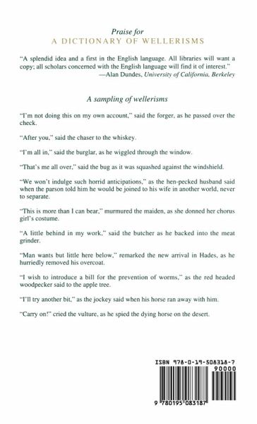The wellerism - so called in English because it is a form of expression typical or reminiscent of Sam Weller or his father, two celebrated characters in Dickens's Pickwick Papers - is a major subtype of the proverb. It consists of three parts: a speech or statement (often a proverb), identification of the speaker, and identification of the situation, which gives the expression an ironic or humorous twist, often in the form of a pun. A Dictionary of Wellerisms is the first work to collect all of the wellerisms recorded in the English language. Containing a wealth of wit and wisdom, it also offers a preface, bibliography, lengthy introduction, and two indexes, one of speakers, one of situations. Wellerisms: `Prevention is better than cure,' said the pig when it ran away from the butcher. `We'll have to rehearse that,' said the undertaker as the coffin fell out of the car.