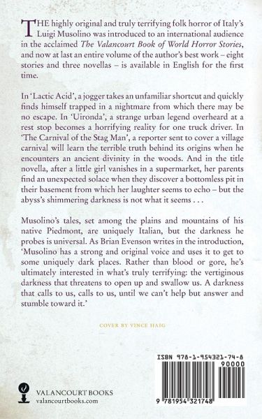 The highly original and truly terrifying folk horror of Italy's Luigi Musolino was introduced to an international audience in the acclaimed The Valancourt Book of World Horror Stories, and now at last an entire volume of the author's best work - eight stories and three novellas - is available in English for the first time. In 'Lactic Acid', a jogger takes an unfamiliar shortcut and quickly finds himself trapped in a nightmare from which there may be no escape. In 'Uironda', a strange urban legend overheard at a rest stop becomes a horrifying reality for one truck driver. 'The Last Box' tells of a grieving contortionist's plan to make contact with his dead trapeze artist wife by twisting his body into the abstruse angles of her mangled corpse. And in the title novella, after a little girl vanishes in a supermarket, her parents find a strange solace when they find a bottomless pit in their basement from which her laughter seems to echo - but the abyss's shimmering darkness is not what it seems ... Musolino's tales, set among the plains and mountains of his native Piedmont, are uniquely Italian, but the darkness he probes is universal. As Brian Evenson writes in the introduction, 'Musolino has a strong and original voice and uses it to get to some uniquely dark places. Rather than blood or gore, he's ultimately interested in what's truly terrifying: the vertiginous darkness that threatens to open up and swallow us. A darkness that calls to us, calls to us, until we can't help but answer and stumble toward it.' 'An experience worthy of David Cronenberg, a sick and monstrous universe where authors like Barker and Ligotti would feel right at home.' - Nicola Lombardi, author of The Gypsy Spiders