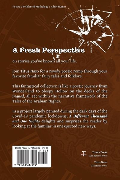 A Fresh Perspective on stories youve known all your life. This fantastical collection is like a poetic journey from Wonderland to Sleepy Hollow on the decks of the Pequod, all set within the narrative framework of the Tales of the Arabian Nights. Join Titus Naso for a rowdy romp through your favorite familiar fairy tales and folklore, all told in verse form, with a wink and a naughty nod. In a project largely penned during the dark days of the Covid-19 pandemic lockdowns, A Different Thousand and One Nights delights and surprises the reader by looking at the familiar in unexpected new ways. Largely written during the Covid-19 pandemic lockdowns, A Different Thousand and One Nights is a satirical poetic survey of the folklore, myths, and fables that permeate our culture. In this poetry collection, Titus Naso turns familiar tales upside-down. Explore the unexpected twists and turns of The Legend of Sleepy Hollow, Alice in Wonderland, Cinderella, Dorothy and the Wizard of Oz, Moby Dick, Paul Bunyan, Rip van Winkle, the Bremen Town Musicians, the classic Greek tales of the Trojan War and the revolt of the giants against the gods, and more: all wrapped up in the timeless frame narrative of the Tales of the Arabian Nights.