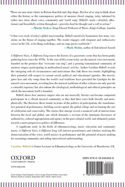This is an open access title available under the terms of a CC BY-NC-ND 4.0 license. It is free to read at Oxford Scholarship Online and offered as a free PDF download from OUP and selected open access locations. A Different Voice, A Different Song traces the history of a grassroots scene that has until now operated largely beneath the radar, but that has been gently gathering force since the 1970s. At the core of this scene today are the natural voice movement, founded on the premise that "everyone can sing", and a growing transnational community of amateur singers participating in multicultural music activity. Author Caroline Bithell reveals the intriguing web of circumstances and motivations that link these two trends, highlighting their potential with respect to current social, political and educational agendas. She investigates how and why songs from the world's oral traditions have provided the linchpin for the natural voice movement, revealing how the musical traditions of other cultures not only provide a colourful repertory but also inform the ideological, methodological and ethical principles on which the movement itself is founded. A Different Voice, A Different Song draws on long-term ethnographic research, including participant-observation at choir rehearsals, performances, workshops and camps, as well as interviews with voice teachers, choir and workshop leaders, camp and festival organisers, and general participants. Bithell shows how amateur singers who are not musically literate can become competent participants in a vibrant musical community and, in the process, find their voice metaphorically as well as literally. She then follows some of these singers as they journey to distant locations to learn new songs in their natural habitat. She theorises these trends in terms of the politics of participation, the transformative potential of performance, building social capital, the global village, and reclaiming the arts of celebration and conviviality. The stories that emerge reveal a nuanced web of intersections between the local and global, one which demands a revision of the dominant discourses of authenticity, cultural appropriation and agency in the post-colonial world, and ultimately points towards a more progressive politics of difference. A Different Voice, a Different Song will be an essential text for practitioners involved in the natural voice movement and other vocal methodologies and choral worlds. As a significant study in the fields of ethnomusicology, music education and community music, the book will also be of interest to scholars studying the democratisation of the voice, the dynamics of participation, world musics in performance, the transformative power of harmony singing, and the potential of music-making for sustaining community and aiding intercultural understanding.