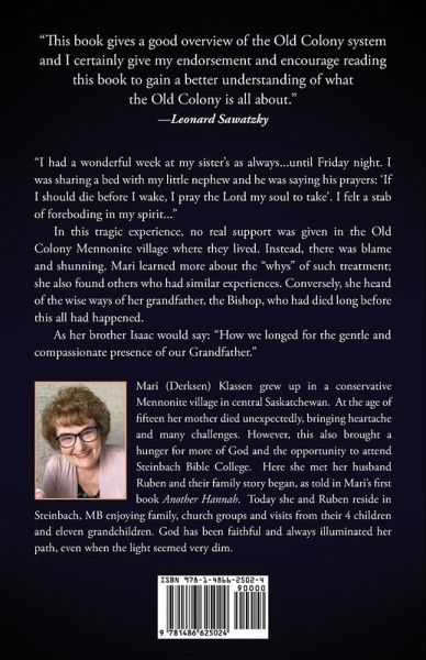 "I had a wonderful week at my sister's as always...until Friday night. I was sharing a bed with my little nephew and he was saying his prayers: 'If I should die before I wake, I pray the Lord my soul to take'. I felt a stab of foreboding in my spirit..." In this tragic experience, no real support was given in the Old Colony Mennonite village where they lived. Instead, there was blame and shunning. Mari learned more about the "whys" of such treatment; she also found others who had similar experiences. Conversely, she heard of the wise ways of her grandfather, the Bishop, who had died long before this all had happened. As her brother Isaac would say: "How we longed for the gentle and compassionate presence of our Grandfather."