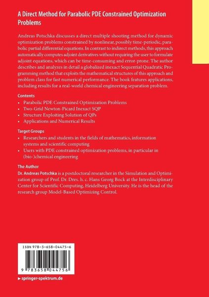 Andreas Potschka discusses a direct multiple shooting method for dynamic optimization problems constrained by nonlinear, possibly time-periodic, parabolic partial differential equations. In contrast to indirect methods, this approach automatically computes adjoint derivatives without requiring the user to formulate adjoint equations, which can be time-consuming and error-prone. The author describes and analyzes in detail a globalized inexact Sequential Quadratic Programming method that exploits the mathematical structures of this approach and problem class for fast numerical performance. The book features applications, including results for a real-world chemical engineering separation problem.