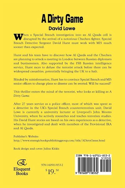When a Special Branch investigation into an Al Qeada cell is disrupted by the arrival of a notorious Chechen fighter, Special Branch Detective Sergeant David Hurst must work with MI5 much sooner than expected. Hurst and his team have to discover how Al Qaeda and the Chechen are planning to attack a meeting in London between Russian diplomats and businessmen. Also supported by the FSB Russian intelligence service, Hurst races to defuse the terrorist attack before there can be widespread casualties, potentially bringing the UK to a halt. Blinded by misinformation, Hurst has to convince Special Branch and MI5 senior officers to change plans so disaster can be averted. Will he succeed? This thriller enters the mind of the terrorist, who looks at killing as A Dirty Game. After 27 years service as a police officer, most of which was spent as a detective in the UK's Special Branch counter-terrorism unit, David Lowe is currently a university lecturer at Liverpool's John Moores University, where he actively researches and teaches terrorism studies. His David Hurst stories are based on his own experiences as a detective, when he investigated and dealt with members of the Provisional IRA and Al Qaeda.