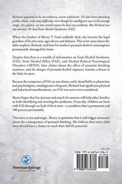 Richard appeared to be an ordinary, active adolescent. He had been attending public school, with some difficulty, even though his intelligence was in the average range. At a glance, no one would suspect he had any problems. But Richard was not normal. He had Fetal Alcohol Syndrome (FAS). When the brother of Sherry T. Ford suddenly died, she became the legal guardian of his two sons, ages eleven and thirteen. This is her story about the older nephew, Richard, and how his mother's prenatal alcohol consumption permanently damaged his brain. Despite that there is a wealth of information on Fetal Alcohol Syndrome (FAS), Fetal Alcohol Effect (FAE), and Alcohol Related Neurological Disorders (ARND), false claims about the effect of prenatal drinking continue, and the danger of prenatal alcohol exposure remains a threat to the baby in utero. Because the symptoms of FAS are not always easily identifiable to physicians and psychologists, misdiagnosis is frequent. Richard had significant physical and behavioral manifestations, yet FAS was never even considered. Sherry hopes that her journey and search for answers will help other families in both identifying and averting the syndrome. Every day, children are born with FAS through no fault of their own--a condition that is permanent and 100 percent preventable. This story is true and tragic. Sherry is optimistic that it will trigger awareness about the consequences of prenatal drinking. She believes that every child born should have a chance to reach their full life potential.