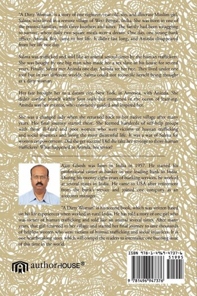 "A Dirty Woman" is a story of one eighteen-year-old, shy, and illiterate Muslim girl, Salma, who lived in a remote village of West Bengal, India. She was born in one of the poorest families, with three brothers and sister. The family had been struggling to survive, where daily two square meals were a dream. One day, one young bank officer, Aninda Roy, came to her life. It didn't last long, and Aninda disappeared from her life one day. Salma was trafficked and sold like an animal several times by the human traffickers. She was bought by one big man who made her a sex slave in his house for several years. Finally, Salma met Aninda one day. Aninda set her free. They lived under one roof but in two different worlds. Salma could not reconcile herself being thought as a dirty woman. Her fate brought her to a dream city, New York, in America, with Aninda. She didn't confine herself within four walls but immersed in the ocean of learning. Aninda was her mentor, who constantly guided and inspired her. She was a changed lady when she returned back to her native village after many years. Her final journey started there. She formed hundreds of self-help groups with those ill-fated and poor women who were victims of human trafficking and social injustices and living the most distressful life. It was a war of Salma for women empowerment. Did she get success? Did she take her revenge to those human traffickers? What happened to Aninda, her savior?