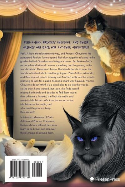 Peek-A-Boo, Princess Cheyenne, and their friends are back for another adventure! Peek-A-Boo, the reluctant runaway, and Princess Cheyenne, the pampered Persian, love to spend their days together relaxing in the garden behind Grandma and Megan's house. But Peek-A-Boo's raccoon friend Miranda senses something bad happening in the woods behind Grandma's house. The friends decide to enter the woods to find out what could be going on. Peek-A-Boo, Miranda, and their squirrel friends Cheeky and Norbert walk into the woods, planning to look for a cabin Miranda heard was haunted. Princess Cheyenne doesn't think it's a good idea to go into the woods, so she stays home instead. But soon, she finds herself missing her friends and decides to find them to join their adventure. Instead, she finds the cabin and meets its inhabitants. What are the secrets of the inhabitants of the cabin, and why must the princess keep their secrets? In this next adventure of Peek-A-Boo and Princess Cheyenne, the friends face difficult decisions, learn to be brave, and discover there's magic all around them.