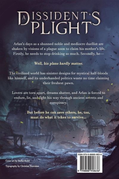 Arlan's days as a shunned noble and mediocre duellist are shaken by visions of a plague soon to claim his mother's life. Firstly, he needs to stop drinking so much. Secondly, he- Well, his plans hardly matter. The civilized world has sinister designs for mystical half-bloods like himself, and its underhanded politics waste no time claiming their freshest pawn. Lovers are torn apart, dreams shatter, and Arlan is forced to endure, lie, and fight his way through ancient secrets and conspiracy. But before he can save others, he, too, must do what it takes to survive...