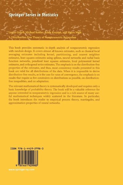 From the reviews: MATHEMATICAL REVIEWS "...this book is written by a highly competent, international team of researchers, who have made important contributions and have had a large impact on the field of nonparametric regression estimation and are still active in different subfields; the monograph is almost self-contained and written in such a way that it is a valuable resource for both the researches and graduate students who are novices in the field. The above is possible thanks to the authors... clear and systematic way of presenting fundamental results and their proofs...this book is a valuable source of mathematical techniques and provides systematic in-depth analysis of nonparametric regression with random design. Although this research monograph reflects recent studies in the field, it can also serve as an encyclopedia of nonparametric regression estimation." SHORT BOOK REVIEWS "The book gives a deep and modern mathematical treatment of nonparametric regression with random design. From the table of contents it is seen that all well-known classes of estimators are dealt with. For each of them, the authors mainly prove results on consistency and on rates of convergence. The book follow the style Theorem-Proof and gives rigorous derivations of all the results. There is a useful mathematical appendix with proofs and exponential type inequalities for sums of independent variables and for sum of martingale differences. Each chapter has a section called "Bibliographic Notes" containing references to the extensive bibliography of more than 400 items. Each chapter ends with a number of problems and exercises, which could be used in a teaching situation."