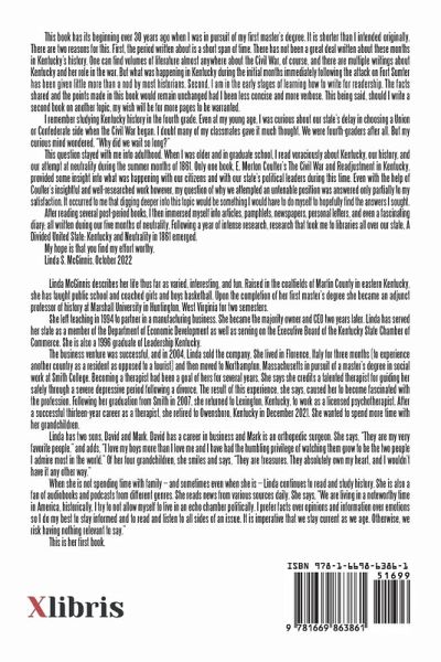 This book has its beginning over 30 years ago when I was in pursuit of my first master's degree. It is shorter than I intended originally. There are two reasons for this. First, the period written about is a short span of time. There has not been a great deal written about these months in Kentucky's history. One can find volumes of literature almost anywhere about the Civil War, of course, and there are multiple writings about Kentucky and her role in the war. But what was happening in Kentucky during the initial months immediately following the attack on Fort Sumter has been given little more than a nod by most historians. Second, I am in the early stages of learning how to write for readership. The facts shared and the points made in this book would remain unchanged had I been less concise and more verbose. This being said, should I write a second book on another topic, my wish will be for more pages to be warranted. I remember studying Kentucky history in the fourth grade. Even at my young age, I was curious about our state's delay in choosing a Union or Confederate side when the Civil War began. I doubt many of my classmates gave it much thought. We were fourth-graders after all. But my curious mind wondered, "Why did we wait so long?" This question stayed with me into adulthood. When I was older and in graduate school, I read voraciously about Kentucky, our history, and our attempt at neutrality during the summer months of 1861. Only one book, E. Merton Coulter's The Civil War and Readjustment in Kentucky, provided some insight into what was happening with our citizens and with our state's political leaders during this time. Even with the help of Coulter's insightful and well-researched work however, my question of why we attempted an untenable position was answered only partially to my satisfaction. It occurred to me that digging deeper into this topic would be something I would have to do myself to hopefully find the answers I sought. After reading several post-period books, I then immersed myself into articles, pamphlets, newspapers, personal letters, and even a fascinating diary; all written during our five months of neutrality. Following a year of intense research, research that took me to libraries all over our state, A Divided United State: Kentucky and Neutrality in 1861 emerged. My hope is that you find my effort worthy. Linda S. McGinnis, October 2022