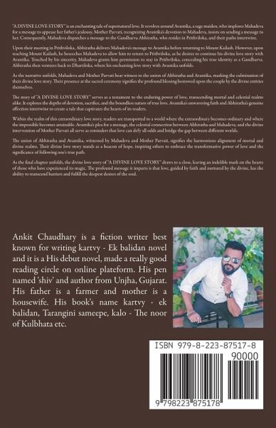 "A DIVINE LOVE STORY" is an enchanting tale of supernatural love. It revolves around Avantika, a sage maiden, who implores Mahadeva for a message to appease her father's jealousy. Mother Parvati, recognizing Avantika's devotion to Mahadeva, insists on sending a message to her. Consequently, Mahadeva dispatches a message to the Gandharva Abhiratha, who resides in Prithviloka, and their paths intertwine. Upon their meeting in Prithviloka, Abhiratha delivers Mahadeva's message to Avantika before returning to Mount Kailash. However, upon reaching Mount Kailash, he beseeches Mahadeva to allow him to return to Prithviloka, as he desires to continue his divine love story with Avantika. Touched by his sincerity, Mahadeva grants him permission to stay in Prithviloka, concealing his true identity as a Gandharva. Abhiratha then ventures back to Dhartiloka, where his enchanting love story with Avantika unfolds. As the narrative unfolds, Mahadeva and Mother Parvati bear witness to the union of Abhiratha and Avantika, marking the culmination of their divine love story. Their presence at the sacred ceremony signifies the profound blessing bestowed upon the couple by the divine entities themselves. The story of "A DIVINE LOVE STORY" serves as a testament to the enduring power of love, transcending mortal and celestial realms alike. It explores the depths of devotion, sacrifice, and the boundless nature of true love. Avantika's unwavering faith and Abhiratha's genuine affection intertwine to create a tale that captivates the hearts of its readers. Within the realm of this extraordinary love story, readers are transported to a world where the extraordinary becomes ordinary and where the impossible becomes attainable. Avantika's plea for a message, the celestial connection between Abhiratha and Mahadeva, and the divine intervention of Mother Parvati all serve as reminders that love can defy all odds and bridge the gap between different worlds. The union of Abhiratha and Avantika, witnessed by Mahadeva and Mother Parvati, signifies the harmonious alignment of mortal and divine realms. Their divine love story stands as a beacon of hope, inspiring others to embrace the transformative power of love and the significance of following one's true path. As the final chapter unfolds, the divine love story of "A DIVINE LOVE STORY" draws to a close, leaving an indelible mark on the hearts of those who have experienced its magic. The profound message it imparts is that love, guided by faith and nurtured by the divine, has the ability to transcend barriers and fulfill the deepest desires of the soul. In the annals of literature, "A DIVINE LOVE STORY" shines as a timeless testament to the enduring power of love. Its pages echo with the celestial melodies of devotion and the ethereal whispers of divine intervention. This captivating love story serves as a constant reminder that true love knows no boundaries and that the bonds of affection can transcend the realms of gods and mortals alike. As the story comes to a close, the legacy of "A DIVINE LOVE STORY" lives on, forever etched in the hearts of those who have embarked on this extraordinary journey.