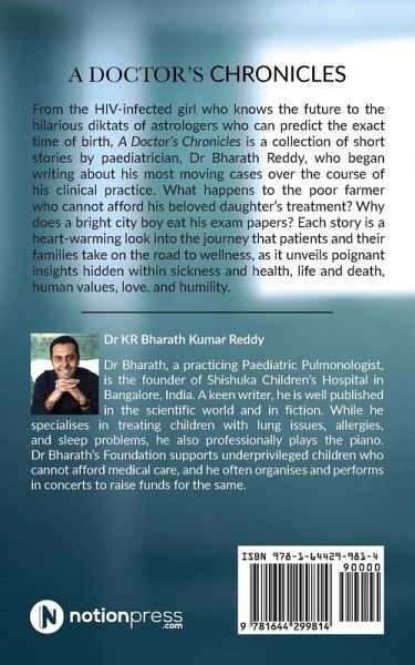 From the HIV-infected girl who knows the future to the hilarious diktats of astrologers who can predict the exact time of birth, A Doctor's Chronicles is a collection of short stories by paediatrician, Dr Bharath Reddy, who began writing about his most moving cases over the course of his clinical practice. What happens to the poor farmer who cannot afford his beloved daughter's treatment? Why does a bright city boy eat his exam papers? Each story is a heart-warming look into the journey that patients and their families take on the road to wellness, as it unveils poignant insights hidden within sickness and health, life and death, human values, love, and humility.
