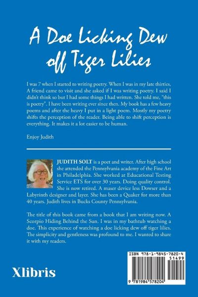 I was 7 when I started to writing poetry. When I was in my late thirties, A friend came to visit and she asked if I was writing poetry. I said I didn't think so but I had some things I had written. She told me, "this is poetry". I have been writing ever since then. My book has a few heavy poems and after the heavy I put in a light poem. Mostly my poetry shifts the perception of the reader. Being able to shift perception is everything. It makes it a lot easier to be human. Enjoy Judith