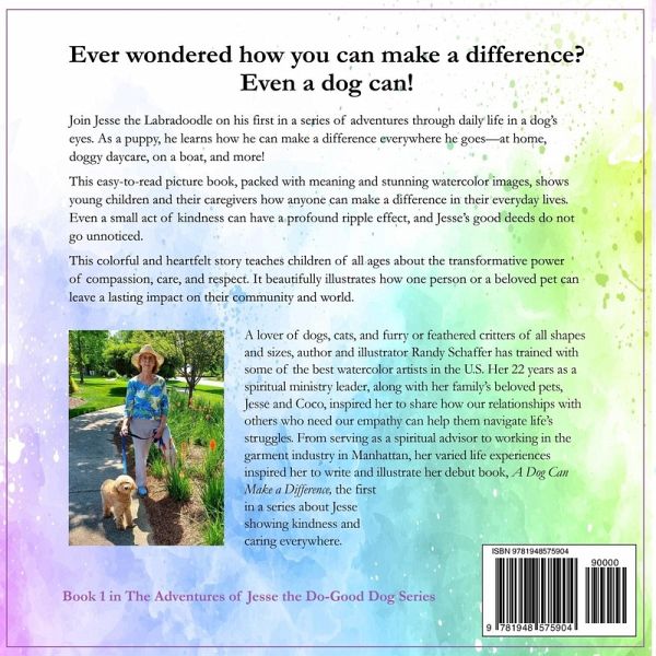 Ever wondered how you can make a difference? Even a dog can! Join Jesse the Labradoodle on his first in a series of adventures through daily life in a dog's eyes. As a puppy, he learns how he can make a difference everywhere he goes-at home, doggy daycare, on a boat, and more! This easy-to-read picture book, packed with meaning and stunning watercolor images, shows young children and their caregivers how anyone can make a difference in their everyday lives. Even a small act of kindness can have a profound ripple effect, and Jesse's good deeds do not go unnoticed. This colorful and heartfelt story teaches children of all ages about the transformative power of compassion, care, and respect. It beautifully illustrates how one person or a beloved pet can leave a lasting impact on their community and world. A lover of dogs, cats, and furry or feathered critters of all shapes and sizes, author and illustrator Randy Schaffer has trained with some of the best watercolor artists in the U.S. Her 22 years as a spiritual ministry leader, along with her family's beloved pets, Jesse and Coco, inspired her to share how our relationships with others who need our empathy can help them navigate life's struggles. She has served on the Advisory Board of the Franciscan Spiritual Center in Aston, Penn., and Board of Oasis Ministries for Spiritual Development. She spent many years in a variety of positions within the garment industry. These life experiences inspired her to write and illustrate her debut book, A Dog Can Make a Difference, the first in a series about Jesse showing kindness and caring everywhere he ventures.