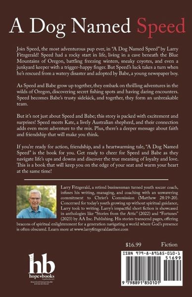 Join Speed, the most adventurous pup ever, in "A Dog Named Speed" by Larry Fitzgerald! Speed had a rocky start in life, living in a cave beneath the Blue Mountains of Oregon, battling freezing winters, sneaky coyotes, and even a junkyard keeper with a trigger-happy finger. But Speed's luck takes a turn when he's rescued from a watery disaster and adopted by Babe, a young newspaper boy. As Speed and Babe grow up together, they embark on thrilling adventures in the wilds of Oregon, discovering secret fishing spots and having daring encounters. Speed becomes Babe's trusty sidekick, and together, they form an unbreakable team. But it's not just about Speed and Babe; this story is packed with excitement and surprises! Speed meets Kate, a lively Australian shepherd, and their connection adds even more adventure to the mix. Plus, there's a deeper message about faith and friendship that will make you think. If you're ready for action, friendship, and a heartwarming tale, "A Dog Named Speed" is the book for you. Get ready to cheer for Speed and Babe as they navigate life's ups and downs and discover the true meaning of loyalty and love. This is a book that will keep you on the edge of your seat and warm your heart at the same time!