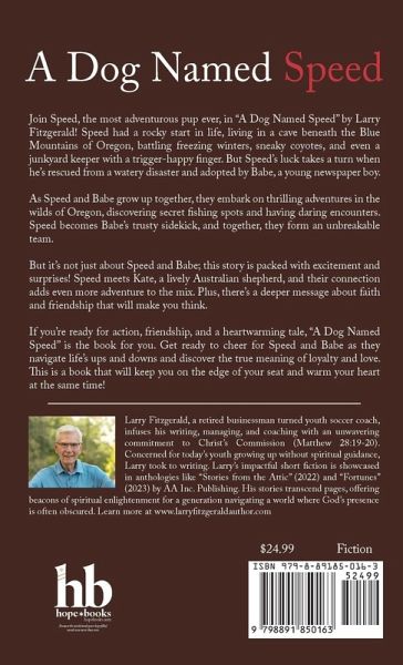Join Speed, the most adventurous pup ever, in "A Dog Named Speed" by Larry Fitzgerald! Speed had a rocky start in life, living in a cave beneath the Blue Mountains of Oregon, battling freezing winters, sneaky coyotes, and even a junkyard keeper with a trigger-happy finger. But Speed's luck takes a turn when he's rescued from a watery disaster and adopted by Babe, a young newspaper boy. As Speed and Babe grow up together, they embark on thrilling adventures in the wilds of Oregon, discovering secret fishing spots and having daring encounters. Speed becomes Babe's trusty sidekick, and together, they form an unbreakable team. But it's not just about Speed and Babe; this story is packed with excitement and surprises! Speed meets Kate, a lively Australian shepherd, and their connection adds even more adventure to the mix. Plus, there's a deeper message about faith and friendship that will make you think. If you're ready for action, friendship, and a heartwarming tale, "A Dog Named Speed" is the book for you. Get ready to cheer for Speed and Babe as they navigate life's ups and downs and discover the true meaning of loyalty and love. This is a book that will keep you on the edge of your seat and warm your heart at the same time!