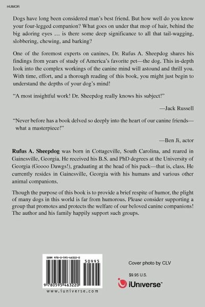 Dogs have long been considered man's best friend. But how well do you know your four-legged companion? What goes on under that mop of hair, behind the big adoring eyes . is there some deep significance to all that tail-wagging, slobbering, chewing, and barking? One of the foremost experts on canines, Dr. Rufus A. Sheepdog shares his findings from years of study of America's favorite pet-the dog. This in-depth look into the complex workings of the canine mind will astound and thrill you. With time, effort, and a thorough reading of this book, you might just begin to understand the depths of your dog's mind! "A most insightful work! Dr. Sheepdog really knows his subject!" -Jack Russell "Never before has a book delved so deeply into the heart of our canine friends-what a masterpiece!" -Ben Ji, actor
