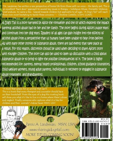A Dog's Tail is a picture book story narrated by Alice the rottweiler and one of which explores the impact parental alcohol abuse had on her and her family. The story begins during Alice's puppy years and continues into her dog years. Readers of all ages can gain insight into the effects of alcohol abuse from a perspective that us humans have been unable to hear from before. As with many other stories of substance abuse, there are sad events that take place as a result. For this reason, discretion should be used when deciding to share Alice's story with younger children. The story can also be used to open up discussion with a child about substance abuse or to bring to light the possible consequences of it. It can also be used as a tool to initiate conversation with readers of all ages on subjects that many people are avoidant of including but not limited to: addiction, death, loss, child abuse, animal abuse, and terminal illness of a parent or loved one. The book is highly recommended for: parents, mental health professionals, children, school guidance counselors, child welfare workers, young adult parents, individuals in recovery or engaged in substance abuse treatment and grandparents.