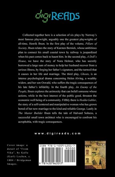 Collected together here is a selection of six plays by Norway's most famous playwright, arguably one the greatest playwrights of all-time, Henrik Ibsen. In the first play of the volume, "Pillars of Society", Ibsen relates the story of Karsten Bernick, whose ambitious plan to connect his small coastal town by railway is jeopardized when his past comes back to haunt him. In the second play, "A Doll's House", we have the story of Nora Helmer, who has secretly borrowed a large sum of money to help her husband recover from a serious illness, by forging her father's signature, and the turmoil that it causes in her life and marriage. The third play, "Ghosts", is an intense psychological drama concerning Helen Alving, a wealthy widow, and her son Oswald, who suffers the tragic consequences of his late father's infidelity. In the fourth play, "An Enemy of the People", Ibsen explores the animosity that can befall someone whose actions, while in the best interest of the public good, threaten the economic well being of a community. Fifthly there is "Hedda Gabler", the story of a self-centered and manipulative woman who has grown bored of her new marriage to the kind and reliable George. Lastly in "The Master Builder" Ibsen tells the tale of Halvard Solness, a successful small town architect who is encouraged to confront his acrophobia, with tragic consequences. This edition is printed on premium acid-free paper.