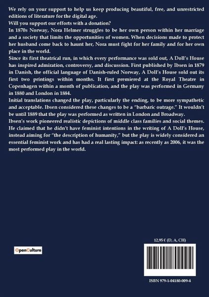 We rely on your support to help us keep producing beautiful, free, and unrestricted editions of literature for the digital age. Will you support our efforts with a donation? In 1870s Norway, Nora Helmer struggles to be her own person within her marriage and a society that limits the opportunities of women. When decisions made to protect her husband come back to haunt her, Nora must fight for her family and for her own place in the world. Since its first theatrical run, in which every performance was sold out, A Doll¿s House has inspired admiration, controversy, and discussion. First published by Ibsen in 1879 in Danish, the official language of Danish-ruled Norway, A Doll¿s House sold out its first two printings within months. It first premiered at the Royal Theatre in Copenhagen within a month of publication, and the play was performed in Germany in 1880 and London in 1884. Initial translations changed the play, particularly the ending, to be more sympathetic and acceptable. Ibsen considered these changes to be a ¿barbaric outrage.¿ It wouldn¿t be until 1889 that the play was performed as written in London and Broadway. Ibsen¿s work pioneered realistic depictions of middle class families and social themes. He claimed that he didn¿t have feminist intentions in the writing of A Doll¿s House, instead aiming for ¿the description of humanity,¿ but the play is widely considered an essential feminist work and has had a real lasting impact: as recently as 2006, it was the most performed play in the world.