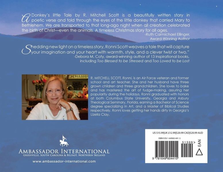 A Donkey's Little Tale by R. Mitchell Scott is a beautifully written story in poetic verse and told through the eyes of the little donkey that carried Mary to Bethlehem. We are transported to that long ago night when all creation celebrated the birth of Christ even the animals. A timeless Christmas story for all ages. Ruth Carmichael Ellinger, Award-Winning Author Preparing for the journey to Bethlehem in order to register for the census, Joseph groomed the gentle donkey colt chosen to accompany him and his with-child bride. Along the way, the charming little beast of burden committed to memory all he saw and heard along the way in hopes that his intuitive insights and attention to detail would be passed down for generations to come. Little did he realize he would be a witness to the birth of the Christ Child, never dreaming he would be pressed into the service of a King. Thus, the little chronicler fills in many gaps in the love story of Joseph and Mary, and the joyous birth of Jesus. This is his little tale.