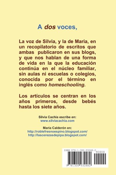 A dos voces es un recopilatorio de entradas de Silvia y Maria agrupadas por temas acerca del llamado homeschooling, o educación en casa o en familia. El libro se centra en los primeros años, desde bebés hasta los siete, y cuenta con escritos de las autoras en los pasados cuatro años de publicación en sus blogs.