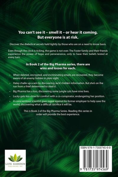 You can't see it - smell it - or hear it coming. But everyone is at risk. Discover the diabolical secrets held tightly by those who are on a need to know basis. Even though the clock is ticking, the game is not over. The Foster family and their friends experience the power of hope and perseverance, only to have their beliefs tested at every turn. In Book 2 of the Big Pharma series, there are wins and losses for each.When deleted, encrypted, and incriminating emails are recovered, they become aware of an enemy hidden in plain sight. Haley chalks up a win by discovering Jack's hidden information. But she's on the run from a thief determined to steal it. Big Pharma has a loss, discovering some jungle cats have nine lives. Lucky gets too close for comfort with a co-conspirator, endangering her position. A conscientious scientist goes rogue against his former employer to help save the world, discovering what a difficult sacrifice it will be. This is Book 2. Reading this series in order will provide the best experience. Romance Heat Level is slightly steamy.