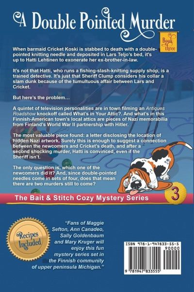 Double Pointed Knitting Needle Becomes Murder Weapon in the Cozy Mystery, A Double-Pointed Murder, a Cozy Knitting Mystery from Ann Yost -Red Jacket, Michigan, On the Keweenaw Peninsula- When Cricket Koski, a barmaid from the Black Fly, is stabbed to death with a double-pointed knitting needle on New Year's Eve and deposited in the bed of Lars Teljo, it's up to Hatti Lehtinen to exonerate her ex-brother-in-law. It's not that Hatti, who runs a fishing-slash-knitting supply shop, is a trained detective. It's just that Sheriff Clump considers his collar a slam dunk because an affair between Lars and Cricket three years earlier has made him vulnerable to blackmail. But there's a problem... Everyone in the tiny, Finnish-American town on the Keweenaw Peninsula has to wear more than one hat and, as acting president of the chamber of commerce, Hatti has to host a quintet of television personalities who arrive unexpectedly to film an Antiques Roadshow knockoff called What's in Your Attic? What's in the local attics are pieces of Nazi memorabilia from Finland's World War II partnership with Hitler and when a letter disclosing the existence of a piece of Nazi artwork is discovered, all attention turns to trying to find the masterpiece. Hatti begins to suspect there's a connection between the arrival of the newcomers and the death of Cricket Koski and after a second shocking murder, she is sure of it. The only question is, which one of them did it? And, since double-pointed needles are packaged in sets of four, does that mean there are two murders still to come? Publisher's Note: The Bait and Stitch Cozy Mystery Series will be enjoyed by readers who appreciate clean, wholesome and humorous mysteries in ethnic settings. Readers who enjoy knitting mysteries as well as fans of Joanne Fluke, CeeCee James, Mildred Abbott and the Black Sheep Knitting Mysteries will not want to miss this captivating series by Ann Yost. The Bait & Stitch Cozy Mystery Series: A Pattern for Murder A Yarn Over Murder A Double-Pointed Murder A Fair Isle Murder