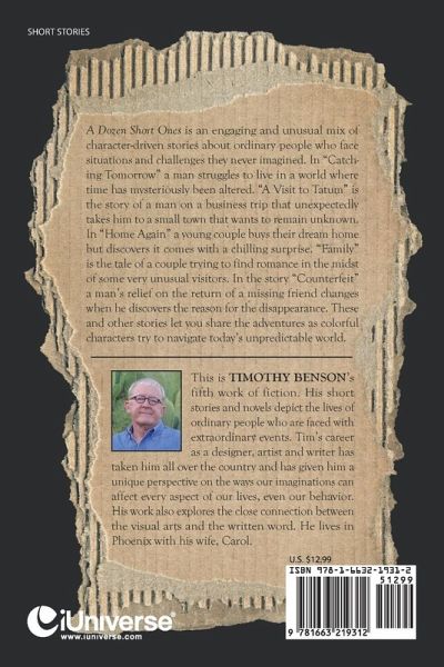 A Dozen Short Ones is an engaging and unusual mix of character-driven stories about ordinary people who face situations and challenges they never imagined. In "Catching Tomorrow" a man struggles to live in a world where time has mysteriously been altered. "A Visit to Tatum" is the story of a man on a business trip that unexpectedly takes him to a small town that wants to remain unknown. In "Home Again" a young couple buys their dream home but discovers it comes with a chilling surprise. "Family" is the tale of a couple trying to find romance in the midst of some very unusual visitors. In the story "Counterfeit" a man's relief on the return of a missing friend changes when he discovers the reason for the disappearance. These and other stories let you share the adventures as colorful characters try to navigate today's unpredictable world.