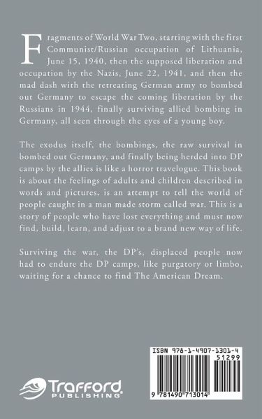 Fragments of World War Two, starting with the first Communist/Russian occupation of Lithuania, June 15, 1940, then the supposed liberation and occupation by the Nazis, June 22, 1941, and then the mad dash with the retreating German army to bombed out Germany to escape the coming liberation by the Russians in 1944, finally surviving allied bombing in Germany, all seen through the eyes of a young boy. The exodus itself, the bombings, the raw survival in bombed out Germany, and finally being herded into DP camps by the allies is like a horror travelogue. This book is about the feelings of adults and children described in words and pictures, is an attempt to tell the world of people caught in a man made storm called war. This is a story of people who have lost everything and must now find, build, learn, and adjust to a brand new way of life. Surviving the war, the DP's, displaced people now had to endure the DP camps, like purgatory or limbo, waiting for a chance to find The American Dream.