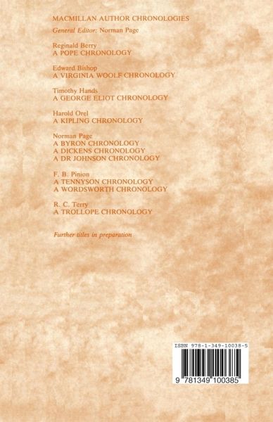 This chronology, like others in the series, presents the story of Dr Johnson's life in a readily accessible format to provide scholar and general reader alike with a quick guide to dates, people and places together with supplementary indexes.