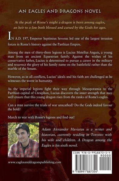 In A.D. 197, Emperor Septimius Severus led one of the largest invasion forces in Rome's history against the Parthian Empire. Among the men of thirty-three legions is Lucius Metellus Anguis, a young man from an ancient Equestrian family. Against the wishes of his conservative father, Lucius is determined to pursue a career in the military and resurrect the glory of his family name on the battlefield rather than the marble of the Senate. However, as in all conflicts, Lucius' ideals and his faith are challenged as he witnesses the worst in humanity. As the imperial legions fight their way through Mesopotamia to the Parthian capital of Ctesiphon, Lucius discovers the inner strength that may well ensure that this young dragon rises from the ranks of Rome's eagles. Can a man survive the trials of war unscathed? Do the Gods indeed favour the bold? March to war with Rome's legions and find out! A Dragon among the Eagles is the first novel in Adam Alexander Haviaras' ground-breaking Eagles and Dragons historical fantasy series. If you like books by Douglas Jackson, Manda Scott, and David Gemmell, or movies like Gladiator and Pompeii, then you will love this historical series that combines adventure, romance, and the supernatural. Get this book now to set off on a thrilling adventure in the Roman Empire! Here is what readers have to say about Eagles and Dragons: Historic Novel Society: "…Haviaras handles it all with smooth skill. The world of third-century Rome-both the city and its African outposts-is colorfully vivid here, and Haviaras manages to invest even his secondary and tertiary characters with believable, three-dimensional humanity." Amazon Readers: "Historical fiction at its best! … if you like your historical fiction to be an education as well as a fun read, this is the book for you!" "An outstanding and compelling novel!" "I would add this author to some of the great historical writers such as Conn Iggulden, Simon Scarrow and David Gemmell. The characters were described in such a way that it was easy to picture them as if they were real and have lived in the past, the book flowed with an ease that any reader, novice to advanced can enjoy and become fully immersed…" Goodreads: "… a very entertaining read; Haviaras has both a fluid writing style, and a good eye for historical detail, and explores in far more detail the faith of the average Roman than do most authors." Epinions: "Well written historical drama with an eye for detail… I can't wait for the next book… Killing the Hydra. There is so much more misery and mischief to puzzle and vex our worthy Metellus."