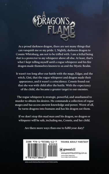 As a proud darkness dragon, there are not many things that can vanquish me or my pride. I, Nightly, darkness dragon to Connie Whitsburg, am not to be trifled with. I am a lethal being that is a protector to my whisperer above all else. At least, that's what I kept telling myself until a rogue whisperer and his fire dragon made themselves known to us and the Mystic Realm. It wasn't too long after our battle with the mage, Edgar, and the witch, Gini, that the rogue whisperer and dragon made their appearance, and it wasn't a coincidence. Connie found out that she was with child after the battle. With the expectancy of the child, she became a greater target to our enemies. The rogue whisperer is strategic, powerful, and unashamed to murder to obtain his desires. He commands a collection of rogue mages and has access to ancient knowledge and power. Worst of all, he turns dragons into humans and has his dragon eat them. If we don't stop this madman and his dragon, no dragon or whisperer will be safe, including me, Connie, and her child. Are there more ways than one to fulfill your duty?