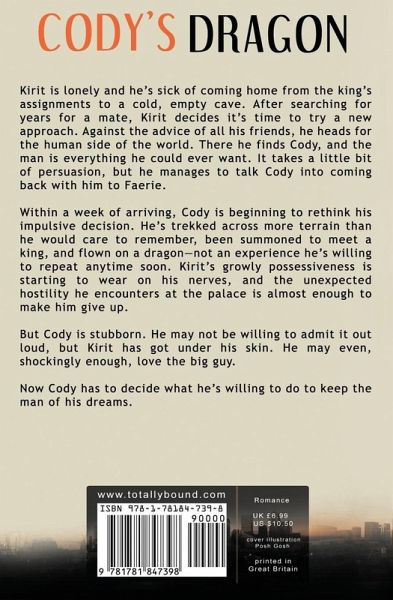 How far is Cody willing to go to keep his dragon? Kirit is lonely and he's sick of coming home from the king's assignments to a cold, empty cave. After searching for years for a mate, Kirit decides it's time to try a new approach. Against the advice of all his friends, he heads for the human side of the world. There he finds Cody, and the man is everything he could ever want. It takes a little bit of persuasion, but he manages to talk Cody into coming back with him to Faerie. Within a week of arriving, Cody is beginning to rethink his impulsive decision. He's trekked across more terrain than he would care to remember, been summoned to meet a king, and flown on a dragon-not an experience he's willing to repeat anytime soon. Kirit's growly possessiveness is starting to wear on his nerves, and the unexpected hostility he encounters at the palace is almost enough to make him give up. But Cody is stubborn. He may not be willing to admit it out loud, but Kirit has got under his skin. He may even, shockingly enough, love the big guy. Now Cody has to decide what he's willing to do to keep the man of his dreams.
