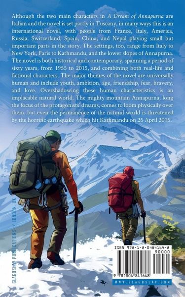 Although the two main characters in A Dream of Annapurna are Italian and the novel is set partly in Tuscany, in many ways this is an international novel, with people from France, Italy, America, Russia, Switzerland, Spain, China, and Nepal playing small but important parts in the story. The settings, too, range from Italy to New York, Paris to Kathmandu, and the lower slopes of Annapurna. The novel is both historical and contemporary, spanning a period of sixty years, from 1955 to 2015, and combining both real-life and fictional characters. The major themes of the novel are universally human and include youth, ambition, age, friendship, fear, bravery, and love. Overshadowing these human characteristics is an implacable natural world. The mighty mountain Annapurna, long the focus of the protagonists' dreams, comes to loom physically over them, but even the permanence of the natural world is threatened by the horrific earthquake which hit Kathmandu on 25 April 2015.