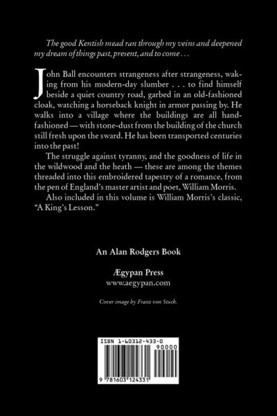 The good Kentish mead ran through my veins and deepened my dream of things past, present, and to come . . . John Ball encounters strangeness after strangeness, waking from his modern-day slumber . . . to find himself beside a quiet country road, garbed in an old-fashioned cloak, watching a horseback knight in armor passing by. He walks into a village where the buildings are all hand-fashioned -- with stone-dust from the building of the church still fresh upon the sward. He has been transported centuries into the past! Also included in this volume is William Morris's classic, "A King's Lesson."
