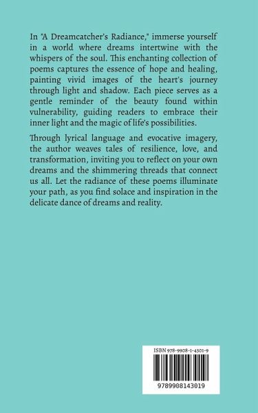 In "A Dreamcatcher's Radiance," immerse yourself in a world where dreams intertwine with the whispers of the soul. This enchanting collection of poems captures the essence of hope and healing, painting vivid images of the heart's journey through light and shadow. Each piece serves as a gentle reminder of the beauty found within vulnerability, guiding readers to embrace their inner light and the magic of life's possibilities. Through lyrical language and evocative imagery, the author weaves tales of resilience, love, and transformation, inviting you to reflect on your own dreams and the shimmering threads that connect us all. Let the radiance of these poems illuminate your path, as you find solace and inspiration in the delicate dance of dreams and reality.
