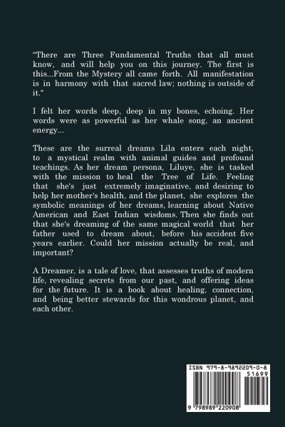 "There are Three Fundamental Truths that all must know, and will help you on this journey. The first is this...From the Mystery all came forth. All manifestation is in harmony with that sacred law; nothing is outside of it." I felt her words deep, deep in my bones, echoing. Her words were as powerful as her whale song, an ancient energy... These are the surreal dreams Lila enters each night, to a mystical realm with animal guides and profound teachings. As her dream persona, Liluye, she is tasked with the mission to heal the Tree of Life. Feeling that she's just extremely imaginative, and desiring to help her mother's health, and the planet, she explores the symbolic meanings of her dreams, learning about Native American and East Indian wisdoms. Then she finds out that she's dreaming of the same magical world that her father used to dream about, before his accident five years earlier. Could her mission actually be real, and important? A Dreamer, is a tale of love, that assesses truths of modern life, revealing secrets from our past, and offering ideas for the future. It is a book about healing, connection, and being better stewards for this wondrous planet, and each other.