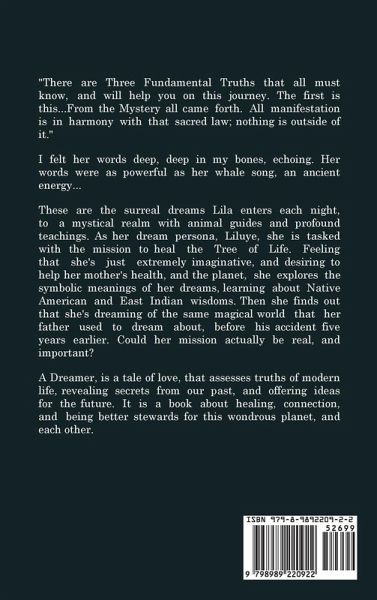 "There are Three Fundamental Truths that all must know, and will help you on this journey. The first is this...From the Mystery all came forth. All manifestation is in harmony with that sacred law; nothing is outside of it." I felt her words deep, deep in my bones, echoing. Her words were as powerful as her whale song, an ancient energy... These are the surreal dreams Lila enters each night, to a mystical realm with animal guides and profound teachings. As her dream persona, Liluye, she is tasked with the mission to heal the Tree of Life. Feeling that she's just extremely imaginative, and desiring to help her mother's health, and the planet, she explores the symbolic meanings of her dreams, learning about Native American and East Indian wisdoms. Then she finds out that she's dreaming of the same magical world that her father used to dream about, before his accident five years earlier. Could her mission actually be real, and important? A Dreamer, is a tale of love, that assesses truths of modern life, revealing secrets from our past, and offering ideas for the future. It is a book about healing, connection, and being better stewards for this wondrous planet, and each other.