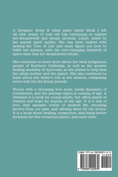 A Dreamer: Book 2 takes place where Book 1 left off, with nearly 13 year old Lila continuing to explore her dreamworld and dream persona, Liluye, aided by her animal spirit guides. She has been tasked with healing the Tree of Life and must figure out how to fulfill her mission, with the ever-changing labyrinth of space-time that her dreamworld entails. She continues to learn more about her local indigenous people of Northern California, as well as the ancient healing modality of Ayurveda, as she yearns to help heal her ailing mother and the planet. She also continues to learn about her father's role in her mission, comparing notes with his old dream journal. Woven with a blooming love story, social dynamics of coexistence, and the passage rights in coming of age. A Dreamer is a book for young adults, but offers pearls of wisdom and hope for anyone of any age. It is a tale of love, that assesses truths of modern life, revealing secrets from our past, and offering ideas for the future. It is a book about healing, connection, and being better stewards for this wondrous planet, and each other.