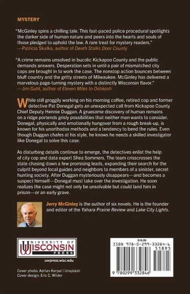 As he finishes a cup of his morning coffee, retired cop and former detective Pat Donegal gets a curious call from the Kickapoo County Chief Deputy Hennie Duggan. A gruesome discovery of human remains on a ridge portends grisly possibilities that neither man wants to consider. Donegal, physically and emotionally hungover from a rough break-up, is known for his unorthodox methods and a tendency to bend the rules. Even though Duggan chafes at his style, he knows he needs a skilled investigator like Donegal to have his back. As strange details continue to emerge, the detectives enlist the help of city cop and data expert Shea Sommers. As the team crisscrosses the state to chase a few promising leads, their search expands beyond local guides and neighbors to members of a sinister, secret hunting society. When Duggan mysteriously disappears—and becomes a suspect himself—Donegal must take over the investigation. He soon realizes the case might not only be unsolvable but could land him in prison—or an early grave.