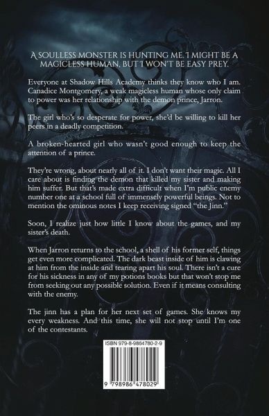 I might be a magicless human, but I won't be easy prey. Everyone at Shadow Hills Academy thinks they know who I am. Canadice Montgomery, a weak magicless human whose only claim to power was her relationship with the demon prince, Jarron. The girl who's so desperate for power, she'd be willing to kill her peers in a deadly competition. A broken-hearted girl who wasn't good enough to keep the attention of a prince. They're wrong, about nearly all of it. I don't want their magic. All I care about is finding the demon that killed my sister and making him suffer. But that's made extra difficult when I'm public enemy number one at a school full of immensely powerful beings. Not to mention the ominous notes I keep receiving signed "the Jinn." Soon, I realize just how little I know about the games, and my sister's death. When Jarron returns to the school, a shell of his former self, things get even more complicated. The dark beast inside of him is growing, clawing at him from the inside and tearing apart his soul. There isn't a cure for his sickness in any of my potions books but that won't stop me from seeking out any possible solution. Even if it means consulting with the enemy. The jinn has a plan for her next set of games. She knows my every weakness. And this time, she will not stop until I'm one of the contestants.