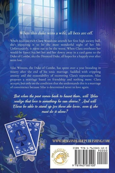 When this duke wins a wife, all bets are off. When nouveau-rich Clara Woodvine attends her first high society ball, she's expecting it to be the most wonderful night of her life. Unfortunately, it turns out to be the worst. When Clara overhears her would-be fiancé has bet her and her dowry away in a card game to the Duke of Combe, aka the Divorced Duke, all hopes for a happily ever after seem lost. Silas Winters, the Duke of Combe, has spent over a year brooding in misery after the end of his toxic marriage. Saddled with crippling anxiety and the reasonability of recovering Clara's reputation, Silas proposes a marriage based on friendship and nothing more. Clara accepts, but only on the condition that she understands this is a marriage of convenience because Silas is determined never to love again But when the past comes back to haunt them, will Silas realize that love is something he can choose? And will Clara be able to stand up for those she loves, even if she must do it alone? Gambling Peers A Duke Makes a Deal The Baron Takes a Bet The Earl Breaks Even