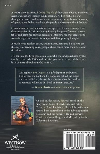A reality show in print, A Dying Way of Life showcases a boy-to-manhood series of excursions through God's creation. As Ben makes his way through the woods and waters where he grew up, he leads us on a journey of appreciation for his world and the people and creatures that inhabit it. Often humorous and sometimes introspective, his stories range from documentaries of "this-is-the-way-it-really-happened" to mostly true fables and campfire tales he heard as a little boy. He encourages us to see-through his eyes-this unique and disappearing lifestyle. A much-loved teacher, coach, and minister, Ben used his tales to set the stage for teaching young people about much more than classroom situations. His sons are the fifth generation to inhabit the land purchased by the family in the early 1900s and the fifth generation to attend the same little country church founded in 1880.