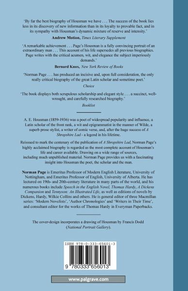 A.E. Housman (1859-1936) was a poet of enormous popularity and widespread influence: a Latin scholar of the front rank, a superb prose stylist, a notable writer of comic verse and, thanks to the enormous success of A Shropshire Lad, one of the greatest and best-known poems in the English language, he became a legend in his own lifetime. Reissued to mark the centenary of the publication of A Shropshire Lad, Norman Page's highly-acclaimed biography is regarded as the most complete account of Housman's life and career available. Drawing on a wide range of sources, including much unpublished material, Norman Page provides us with a fascinating insight into Housman the poet, the scholar and the man. `By far the best biography of Housman we have ...' - Andrew Motion, Times Literary Supplement