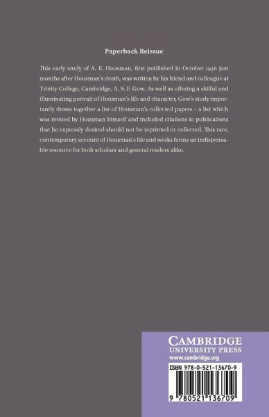 This early study of A. E. Housman, first published in October 1936 just months after Housman's death, was written by his friend and colleague at Trinity College, Cambridge, A. S. F. Gow. As well as offering a skilful and illuminating portrait of Housman's life and character, Gow's study importantly draws together a list of Housman's collected papers - a list which was revised by Housman himself and included citations to publications that he expressly desired should not be reprinted or collected. This rare, contemporary account of Housman's life and works forms an indispensable resource for both scholars and general readers alike.