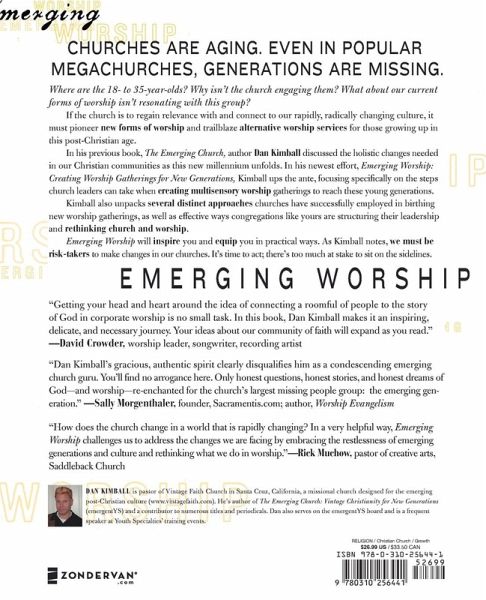 Churches are aging. Even among megachurches with their modern technology and huge number of members, whole generations are now missing. In order to reach the 18-35 year olds, churches need to incorporate alternative worship services into their ministries that meet the unique needs of the emerging generations. In a conversational, narrative style, author Dan Kimball guides church leaders on how to create alternative services from start to finish. Using anecdotes from his own experience at Graceland, Kimball presents six creative models, providing real-life examples of each type. Emerging Worship covers key topics including - Developing a prayer team - Evaluating the local mission field and context - Determining leaders and a vision-based team - Understanding why youth pastors are usually the ideal staff to start a new service - Recognizing the difference in values between emerging worship and the rest of the church - Asking critical questions beforehand
