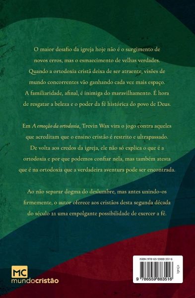 O maior desafio da igreja hoje não é o surgimento de novos erros, mas o esmaecimento de velhas verdades. Quando a ortodoxia cristã deixa de ser atraente, visões de mundo concorrentes vão ganhando cada vez mais espaço. A familiaridade, afinal, é inimiga do maravilhamento. É hora de resgatar a beleza e o poder da fé histórica do povo de Deus. Em A emoção da ortodoxia, Trevin Wax vira o jogo contra aqueles que acreditam que o ensino cristão é restrito e ultrapassado. De volta aos credos da igreja, ele não só explica o que é a ortodoxia e por que podemos confiar nela, mas também atesta que é na ortodoxia que a verdadeira aventura pode ser encontrada. Ao não separar dogma do deslumbre, mas antes unindo-os firmemente, o autor oferece aos cristãos desta segunda década do século 21 uma empolgante possibilidade de exercer a fé.
