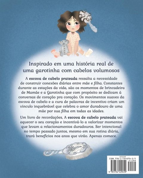 Os movimentos suaves da escova de cabelo e a cura de palavras de incentivo criam um vínculo inquebrável que celebra o amor duradouro de uma mãe por sua filha em todas as idades. A escova de cabelo prateada ressalta a necessidade de construir conexões diárias entre mãe e filha. Constantes durante as estações da vida, são os momentos de brincadeira de Mamãe e a Garotinha que com propósito se dedicam à conversas de coração pra coração. Um livro de recordações, a escova de cabelo de prateada aquecerá o seu coração e encorajará momentos que levam a relações duradouras. Ser intencional no tempo que se passa junto, mesmo na rotina diária, trará benefícios durante anos que estão por vir. Comece. As crianças dos 4 - 8 anos vão gostar de ler esta história doce. A mãe e a avó podem gostar de o ler ainda mais. Pegue a cópia e que comece a tradição!