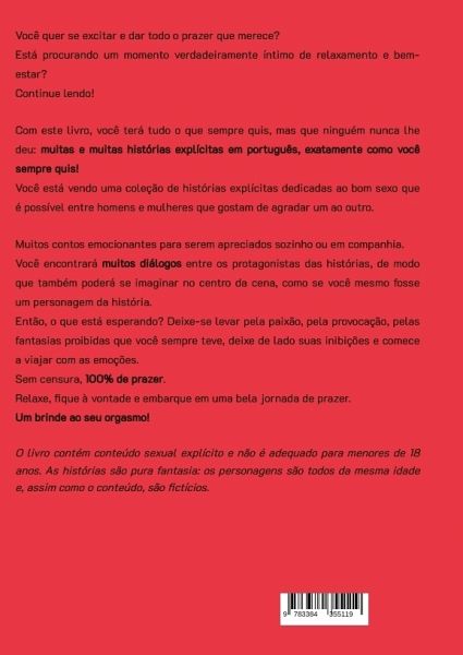 Você quer se excitar e dar todo o prazer que merece?Está procurando um momento verdadeiramente íntimo de relaxamento e bem-estar?Então continue lendo!Com este livro, você terá tudo o que sempre quis e que ninguém nunca lhe deu: muitas e muitas histórias explícitas em português, exatamente como você sempre quis!Você tem diante de si uma coleção de histórias explícitas dedicadas ao bom sexo que é possível entre homens e mulheres que gostam de agradar um ao outro. Muitos contos excitantes para experimentar sozinho ou acompanhado.Você encontrará muitos diálogos entre os protagonistas das histórias, de modo que também poderá se imaginar no centro da cena, como se você mesmo fosse um personagem da história.Então, o que está esperando? Deixe-se levar pela paixão, pela provocação, pelas fantasias proibidas que você sempre teve, deixe de lado suas inibições e comece a viajar com as emoções.Sem censura, 100% de prazer.Relaxe, fique à vontade e embarque em uma bela jornada de prazer.Um brinde ao seu orgasmo!